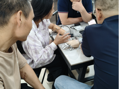 “别紧张,我们先做个肌电信号检测,就像给皮肤‘连 WiFi’一样,让机器先‘认识’你的肌肉。” 康复师傅罗师傅蹲在她身边,手里拿着小巧的电极片,语气里满是温柔。小黄抬起左臂,露出上臂内侧细腻的皮肤,当冰凉的电极片贴上皮肤时,她下意识地缩了缩肩膀,随即又强迫自己放松。监测屏幕上很快跳出细碎的蓝色波纹,“看,你的肌肉信号很清晰,这说明‘新手掌’能跟你配合得很好。” 技术师傅指着屏幕,眼里的笑意让小黄紧绷的嘴角慢慢舒展开。