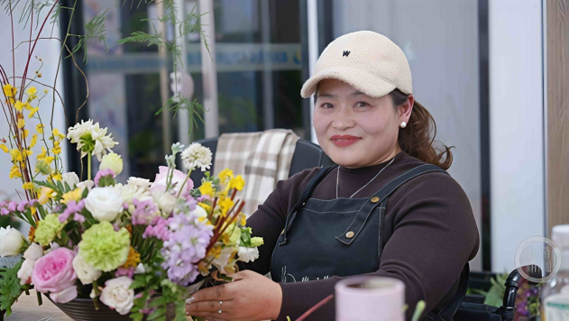 佘敏为插花比赛做准备。